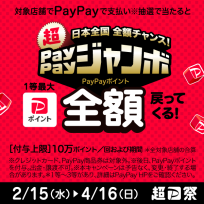 2023年2月15日~2023年4月16日までPayPayでお支払い頂き、抽選で当たるとPayPayポイントが1等最大全額戻ってきます!