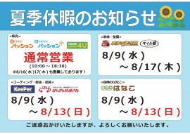 大変勝手ではございますが、当店では8月9日(水)~8月17日(木)に夏季休暇を頂きます。