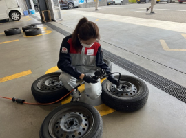 整備の研修では車検整備のやり方を学んだり、タイヤの空気圧の点検など簡単な作業も行います。